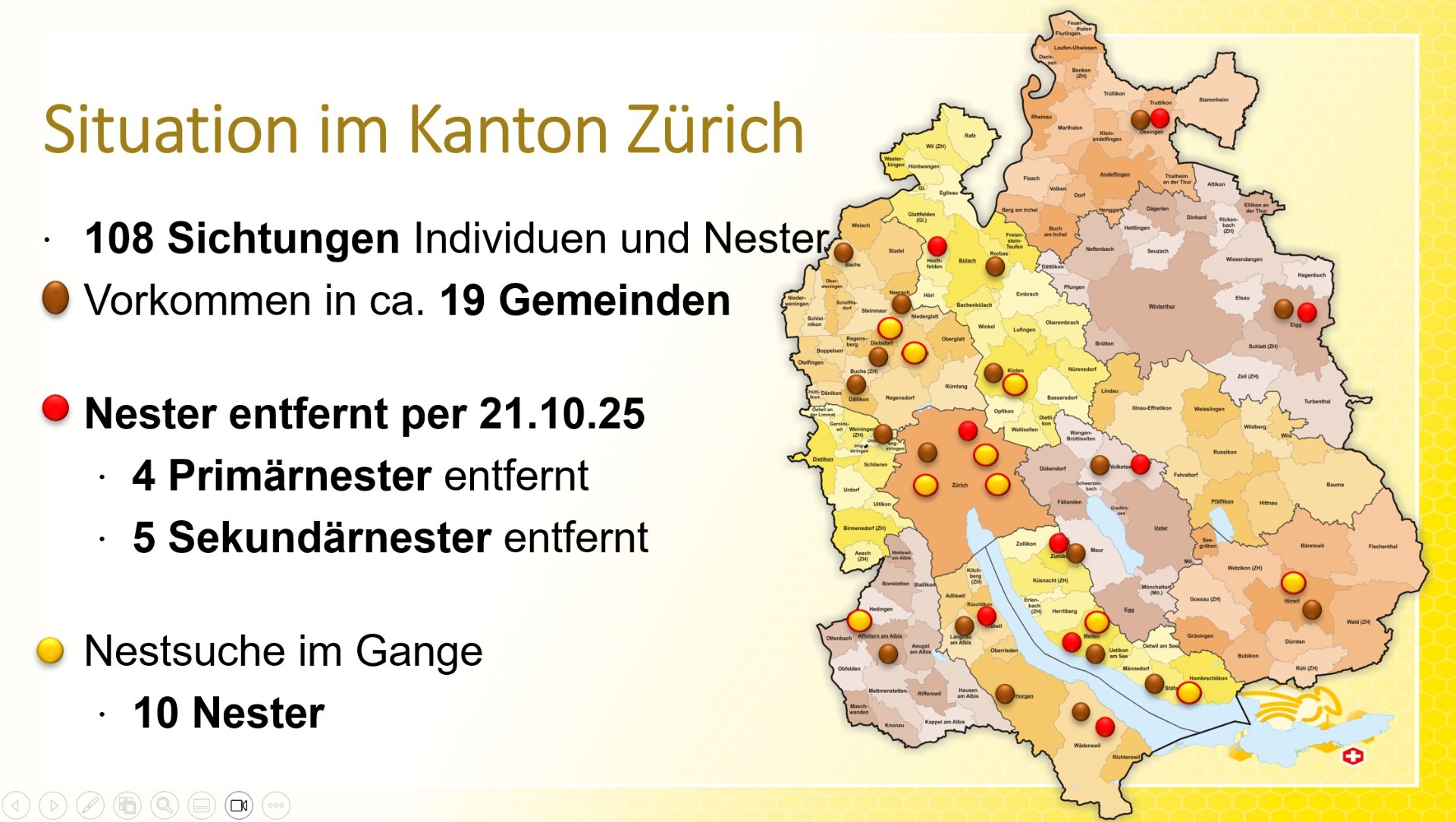 Zudem zeigt Othmar auf, in welchen Gemeinden bereits Asiatische Hornissen gesichtet wurden und wie viele Nester im Kanton Zürich im laufenden Jahr entfernt werden konnten.